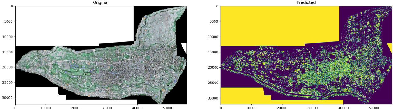 The best model tuned with different optimizer was used for the prediction of the building footprints of Bhaktapur Municipality. For the prediction of the bigger orthomosaics of Bhaktapur Municipaity having a size of (32102, 56024, 3), the best model Unet with resnet152 as backbone was used with RMSprop optimizer. Size of the orthomosaics was very large which couldn’t be performed with limited processing unit. So, patchify of the bigger image was done at a size of 256 with no overlapping of the images. These patched images were used for the prediction and then the predicted images were merged to a single mask image.